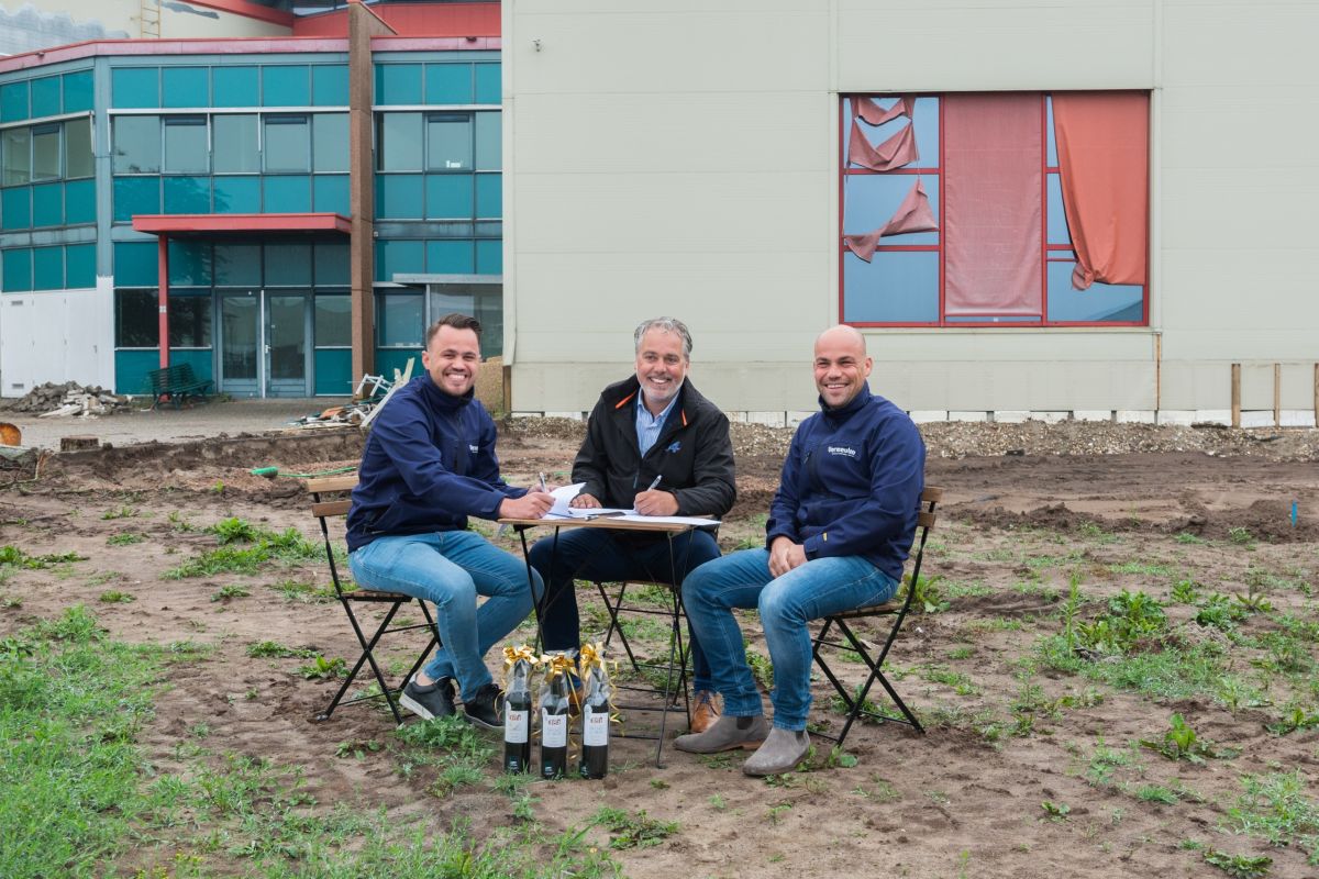 Op de foto: Rik (l) en Niels (r) Vermeulen en Wimfried van Kesteren (m) tekenen de overeenkomst, op de locatie waar straks het nieuwe tankstation verrijst.